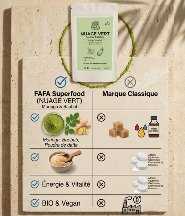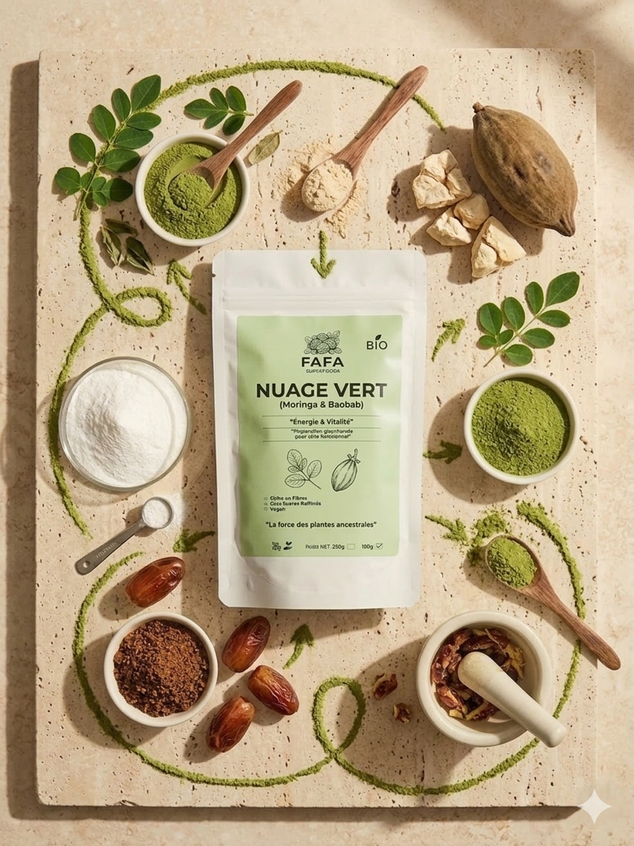 Composition Premium : Lait de coco, Beurre de cacao en poudre, TCM (Triglycérides à Chaîne Moyenne), Poudre de Moringa, Pulpe de Baobab, Poudre de datte, L-glutamine. (100% végétal, sans additifs ni conservateurs).